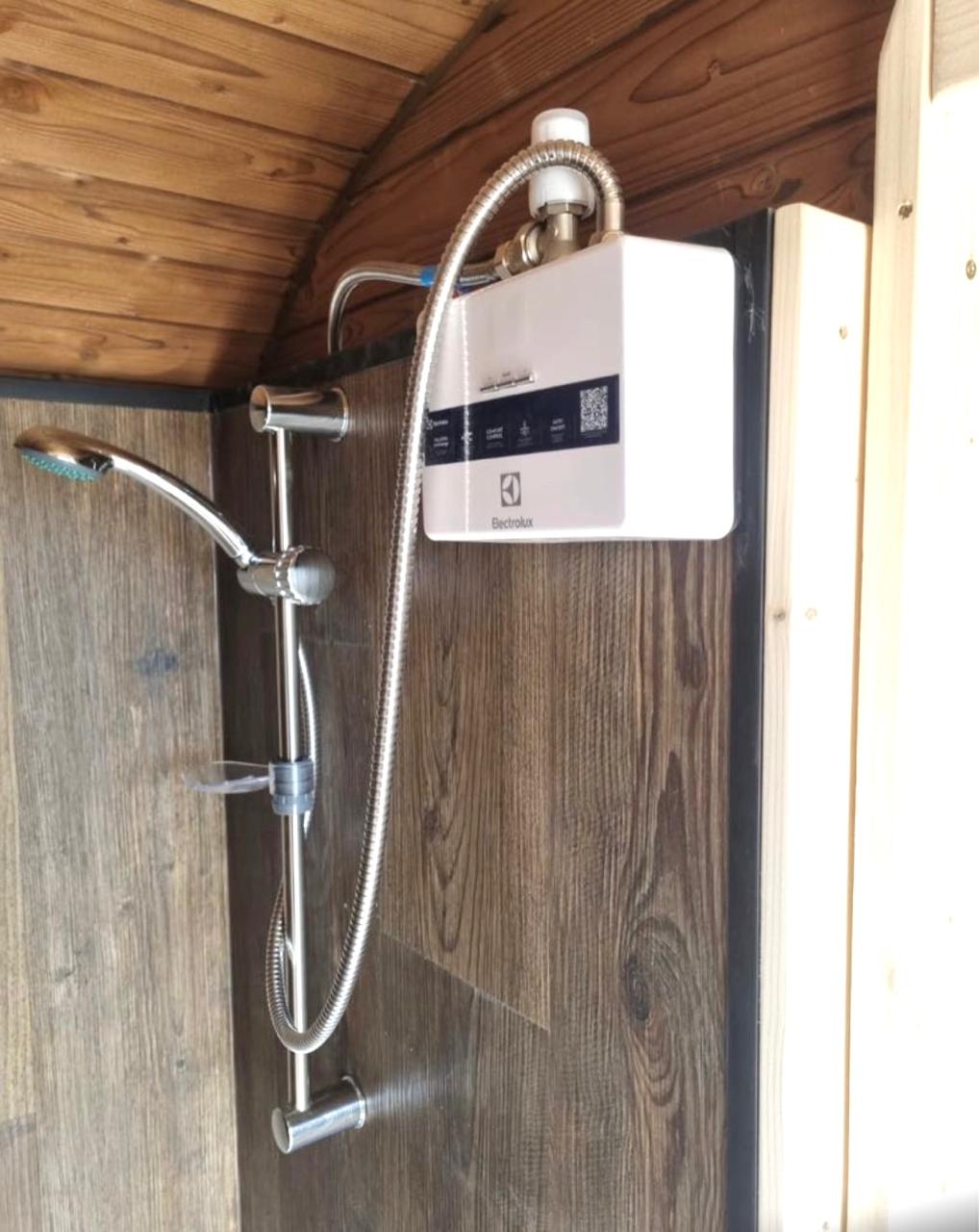 Polici, klopi, talne lesene rešetke, sod za vročo vodo, plastična vhodna vrata, grelec vode Electrolux