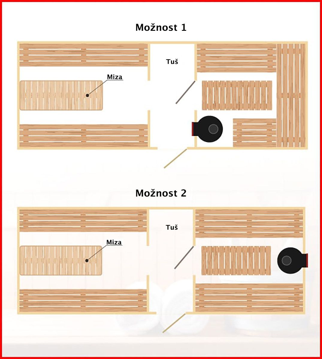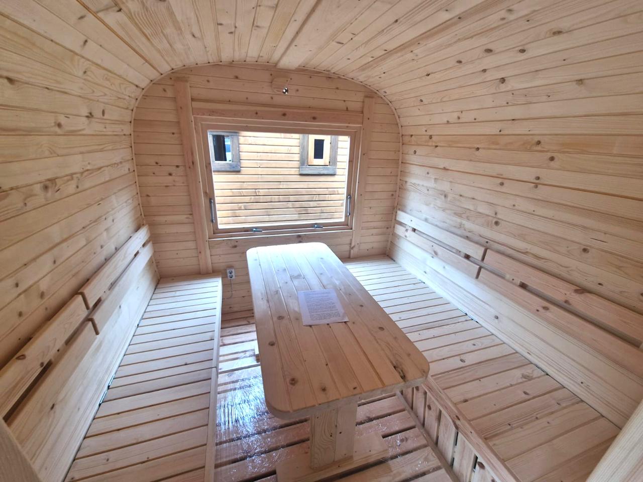 Profil smreke vlažnosti 8% , predsoba 2,3×2,2 m, soba za savnanje 2,25×2,25 m, tuš kabine 0,9×0,9 m